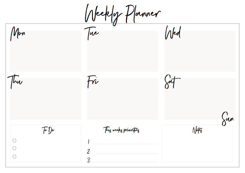 wie ihr wisst liebe ich Kalender, Listen und Planer und daher habe ich einenn eigenen Weekly Planner entworfen, den ich heute mit euch teilen möchte. Der Weekly Planner ist ganz einfach aufgebaut und hat ein Feld für jeden Wochentag außer für das Wochenende – da unterteilt sich das Feld für den Samstag und den Sonntag. Darunter gibt es ein Kästchen für die wöchentlichen To-Dos, Linien für die Prioritäten sowie ein Kästchen für Notizen, die irgendwie immer anfallen.