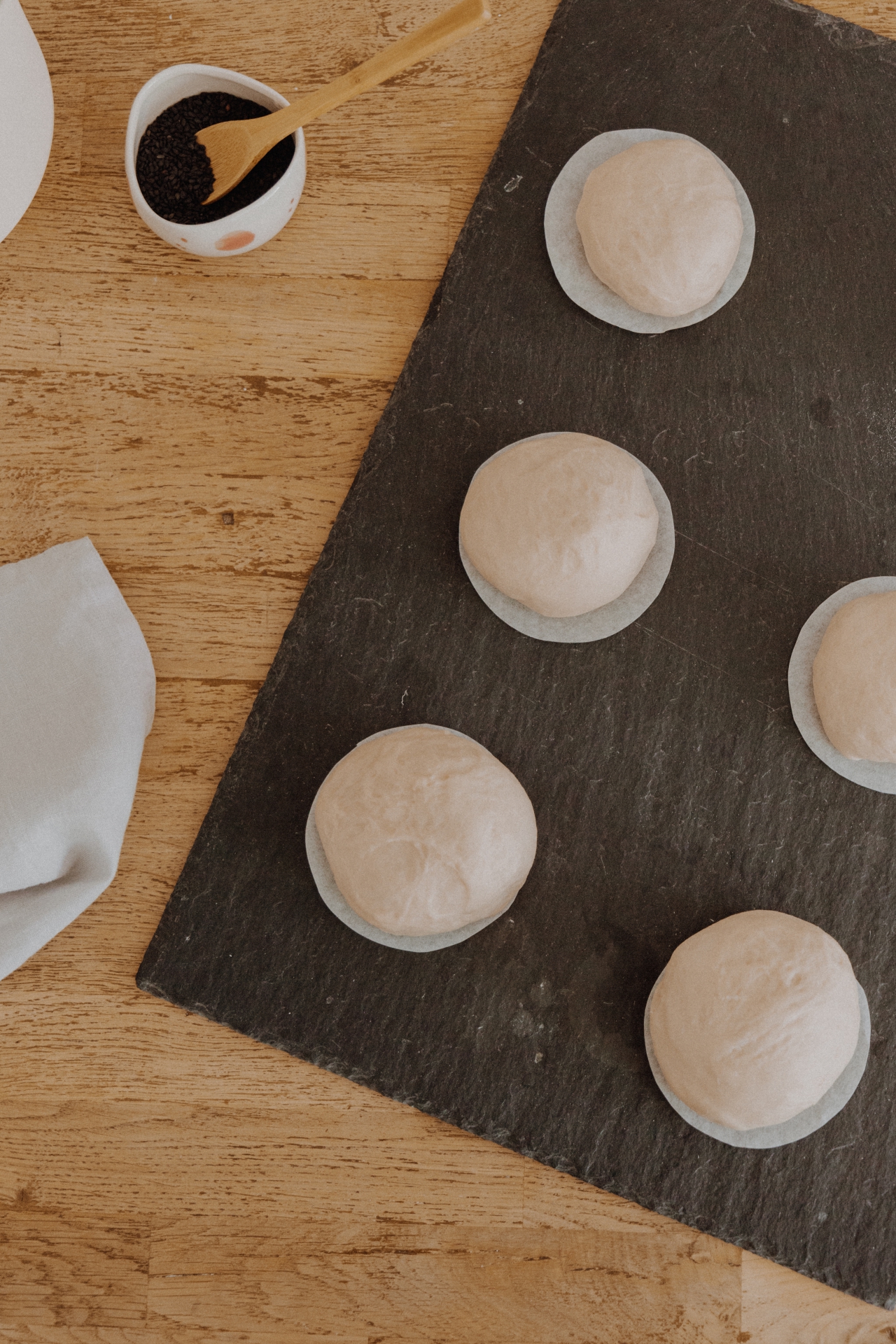 - Wenn der Teig aufgegangen ist, formt ihn zu runden Buns und legt diese auf ein Stück Backpapier