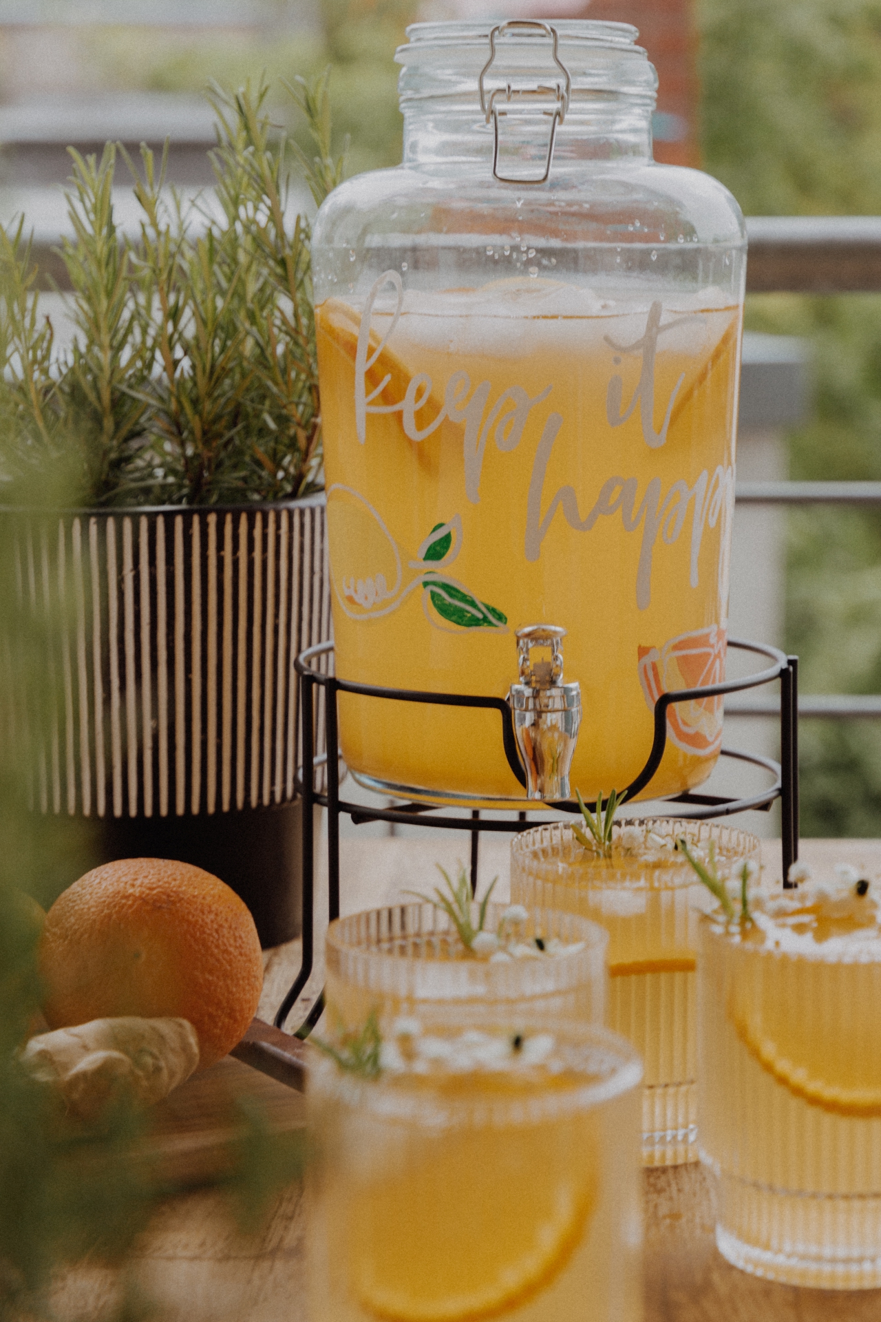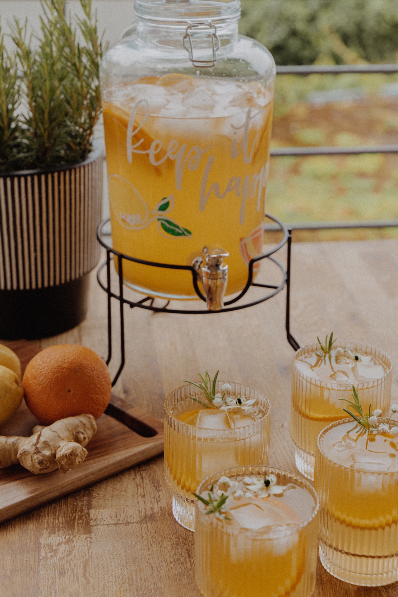 Ob er den eigenen Balkon schmückt, Hingucker auf der nächsten Grillparty mit Freunden wird oder mit toller Personalisierung alle Blicke bei der Hochzeit oder einem Geburtstag auf sich zieht: Besonders mit dem Inhalt einer Orangen-Rosmarin Limonade sorgt er für gute Laune!