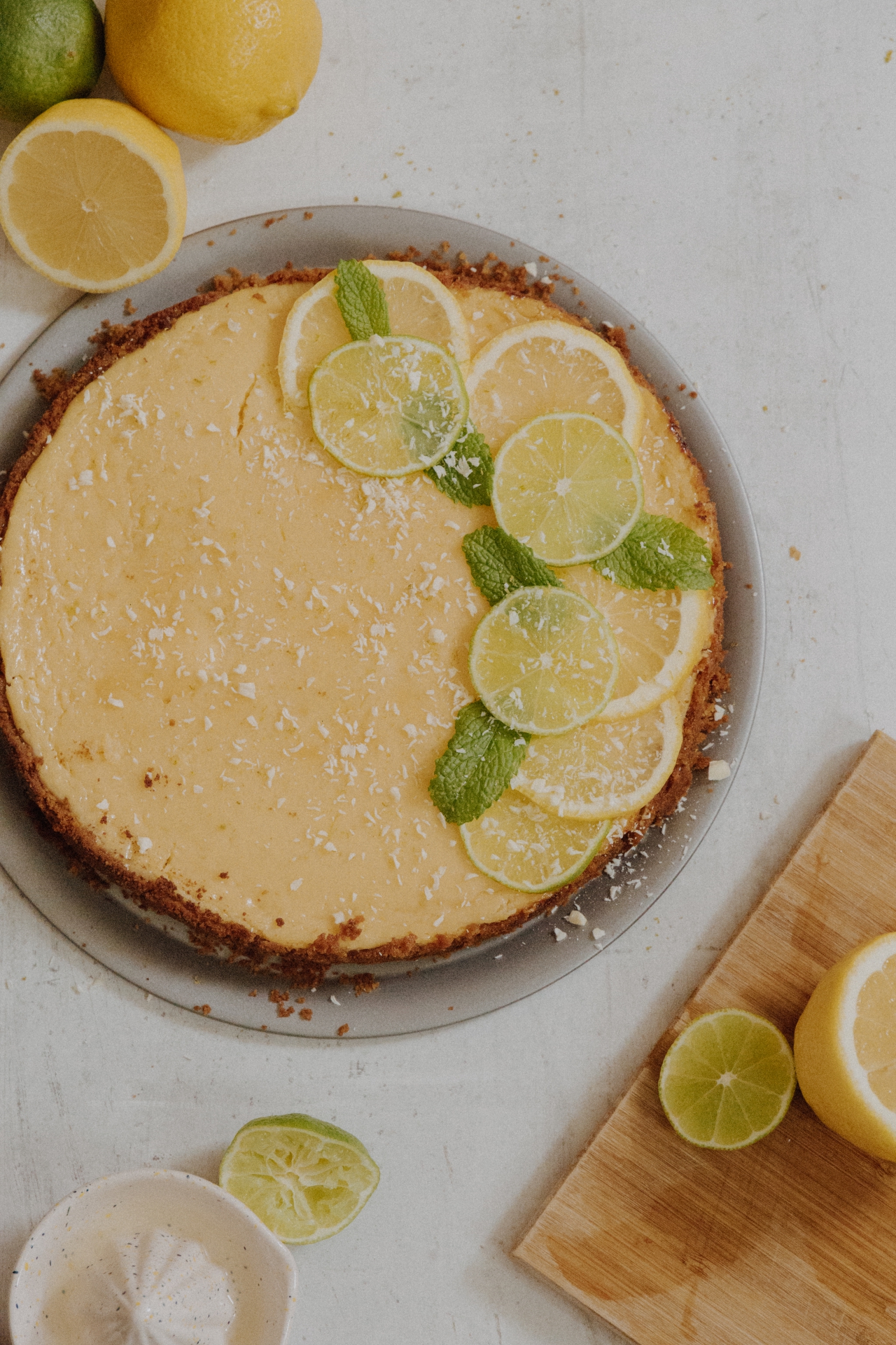 - Anschließend könnt ihr euren Key Lime Pie mit Zitronen- & Limettenscheiben und Minzblättern garnieren sowie ein wenig geraspelte weiße Schokolade darüber streuen