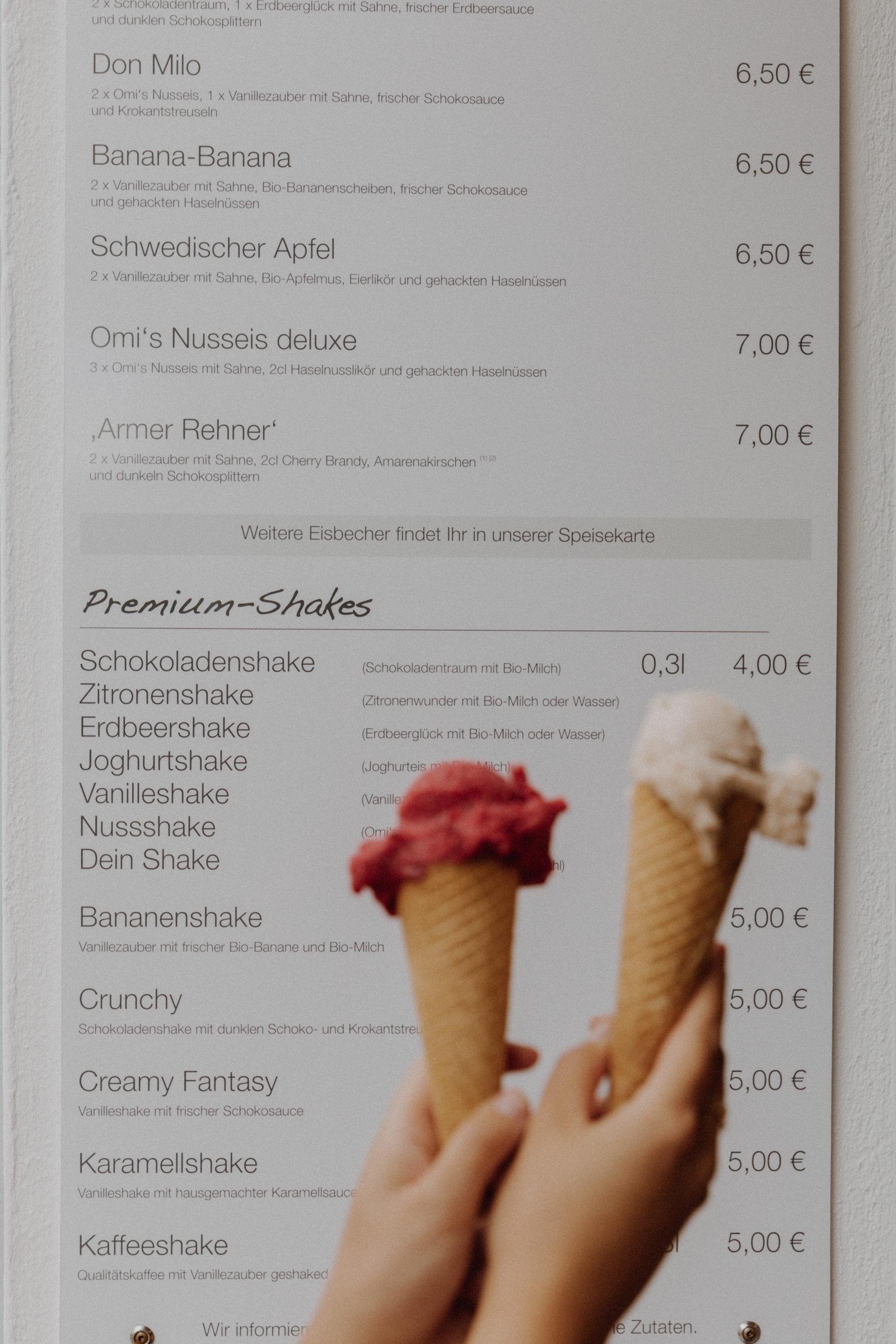 Meine Favourites? So gut wie immer das Monatseis, das monatlich wechselnd für eine Überraschung sorgt und somit die bereits super Auswahl bereichert: um ein Früchtcheneis, ein Erdnusseis oder im Winter auch ein Printeneis. Ihr seht hier ist alles dabei! Darüber hinaus darf immer wieder das Nusseis, das Joghurteis mit Himbeersoße, das Zitronensorbet oder auch das Zitronensorbet in meinen Becher. Was nie fehlt: der essbare Löffel. Diese bestehen aus Hafer und ersetzen so Plastik- oder Holzlöffel, was ich persönlich klasse finde. Die Innovationen finden sich hier nicht nur in den Eiskreationen und -konzepten wieder, sondern auch auf allen anderen Ebenen: Er hat die Umwelt im Blick und vermeidet so viel Plastik wie möglich, daher gibt es hier die Strohhalme der Milkshakes in Nudelform.