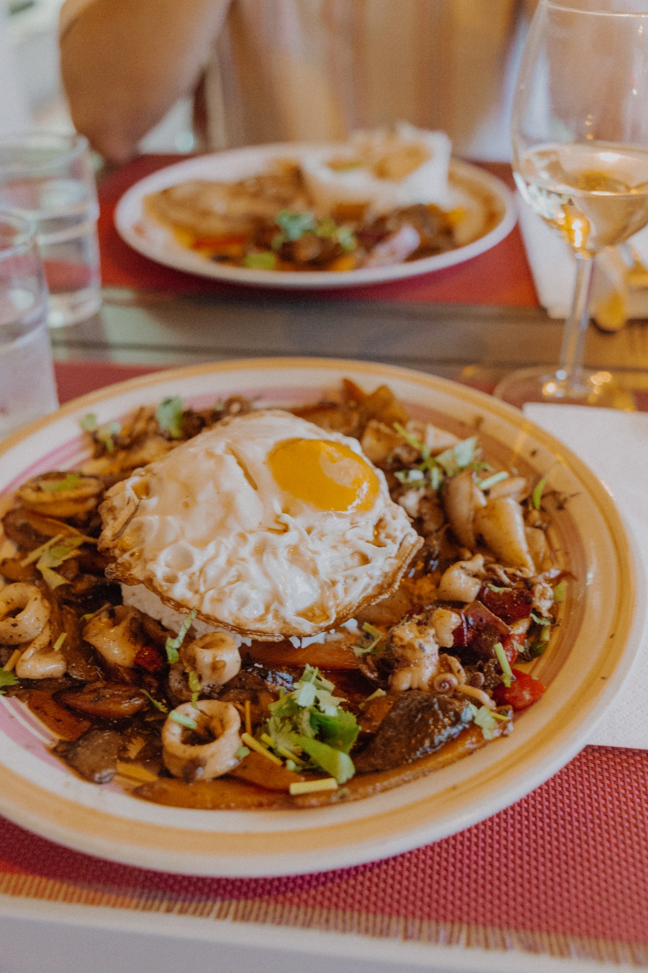 Nach der Abkühlung hatten wir noch ca. 30 Minuten Fahrt vor uns bis zum nächsten Stop für die Nacht und zwar in Bonifacio. Bonifacio ist eine tolle Stadt, in der wir am Hafen entlang geschlendert sind, den Ausblick von der Zitadelle genossen haben und das wohl leckerste Essen hatten. Gegessen haben wir in der Oberstadt, so wird die Zitadelle auch genannt. Ein Spaziergang durch die Altstadt hat uns zu Fuß hinauf geführt und durch das Genua Tor bis zu Le Bastion. Das familiengeführte Restaurant, in dem die Frau in der Küche phänomenales Essen zaubert und der Mann sowie die Kinder den Service leiten, müsst ihr auf alle Fälle besuchen. Hier gibt es auch eine englische Karte, was auf einer Korsika Reise für alle nicht französisch-Sprechenden eine Wohltat ist. Unsere Wahl viel letztendlich auf Fisch mit Reis und Gemüse sowie Reis mit Gemüse und Tintenfisch, wobei meins mit dem Tintenfisch mit einem Spiegelei kam. Klingt vielleicht komisch, aber es war so gut, dass wir aus dem Staunen nicht mehr herauskamen.