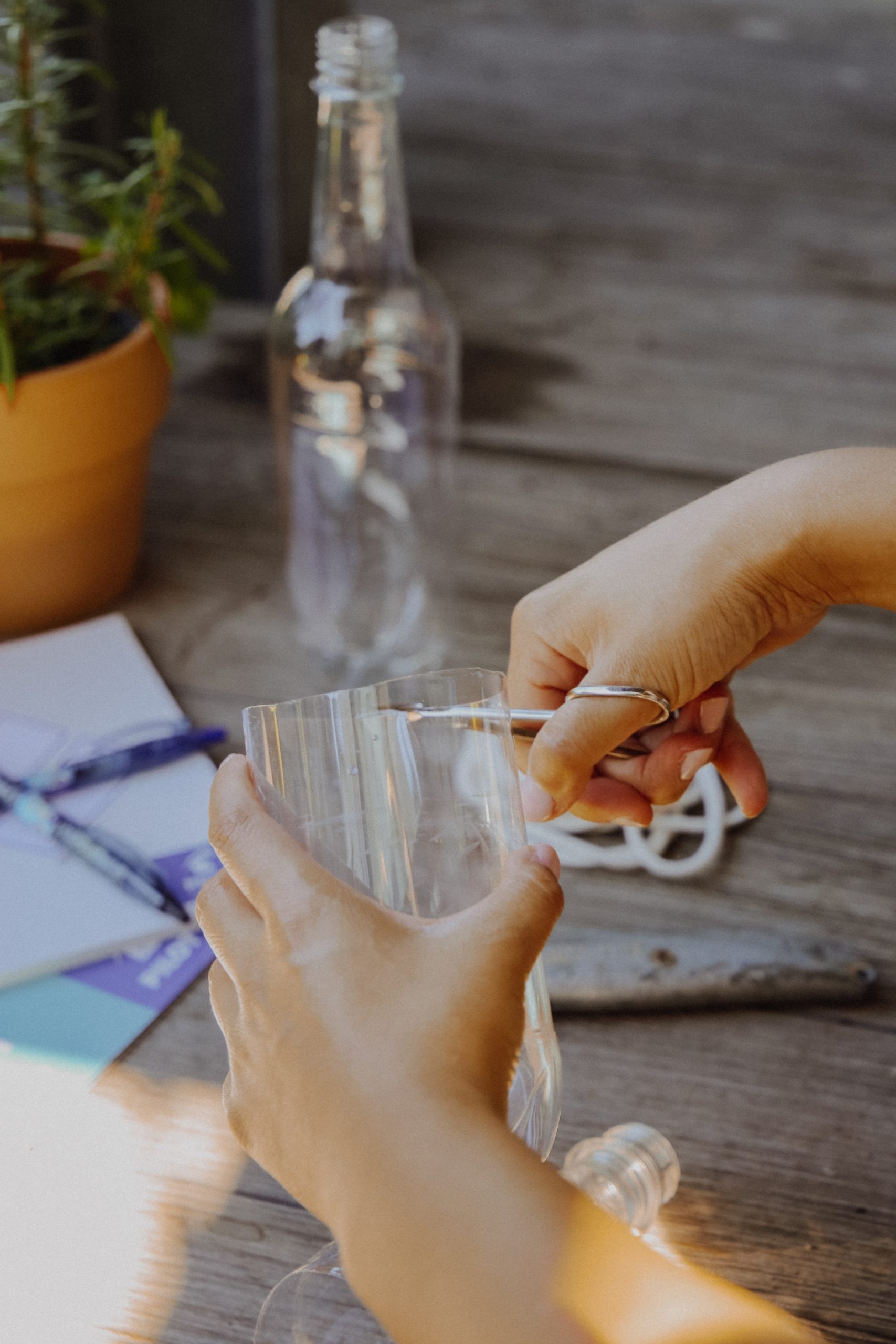 - Messt anschließend die Höhe der Flasche aus. Ungefähr in der Mitte könnt ihr die Flasche mithilfe eines Teppichmessers teilen. Die obere Hälfte darf gerne ein bis zwei Zentimeter kürzer sein.
