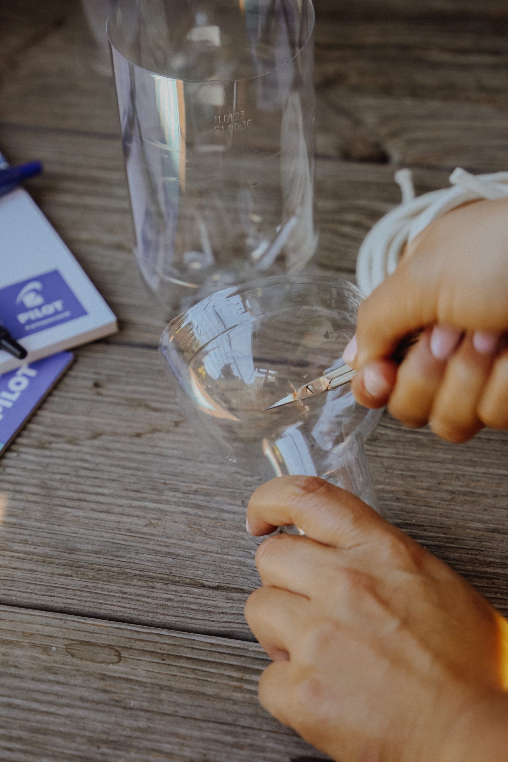 - Gebt anschließend Wasser in den unteren Teil der Flasche und steckt den oberen Teil mit den Kordeln ins Wasser darauf!
