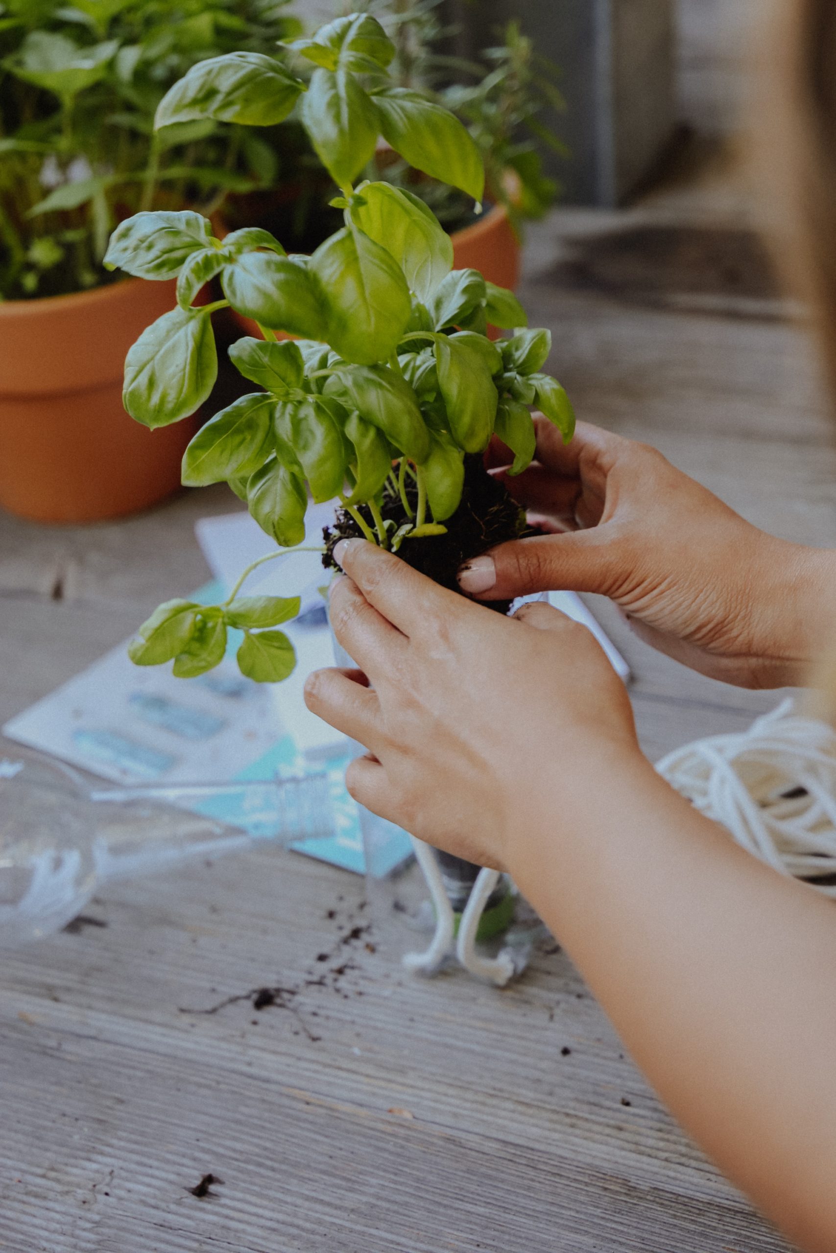 - Dann geht es schon an das Befüllen eurer Self Watering Bottles. Hierzu könnt ihr beispielsweise Reste genutzter Küchenkräuter einpflanzen, um diese lange frisch zu halten und einen weiteren nachhaltigen Beitrag zu leisten.