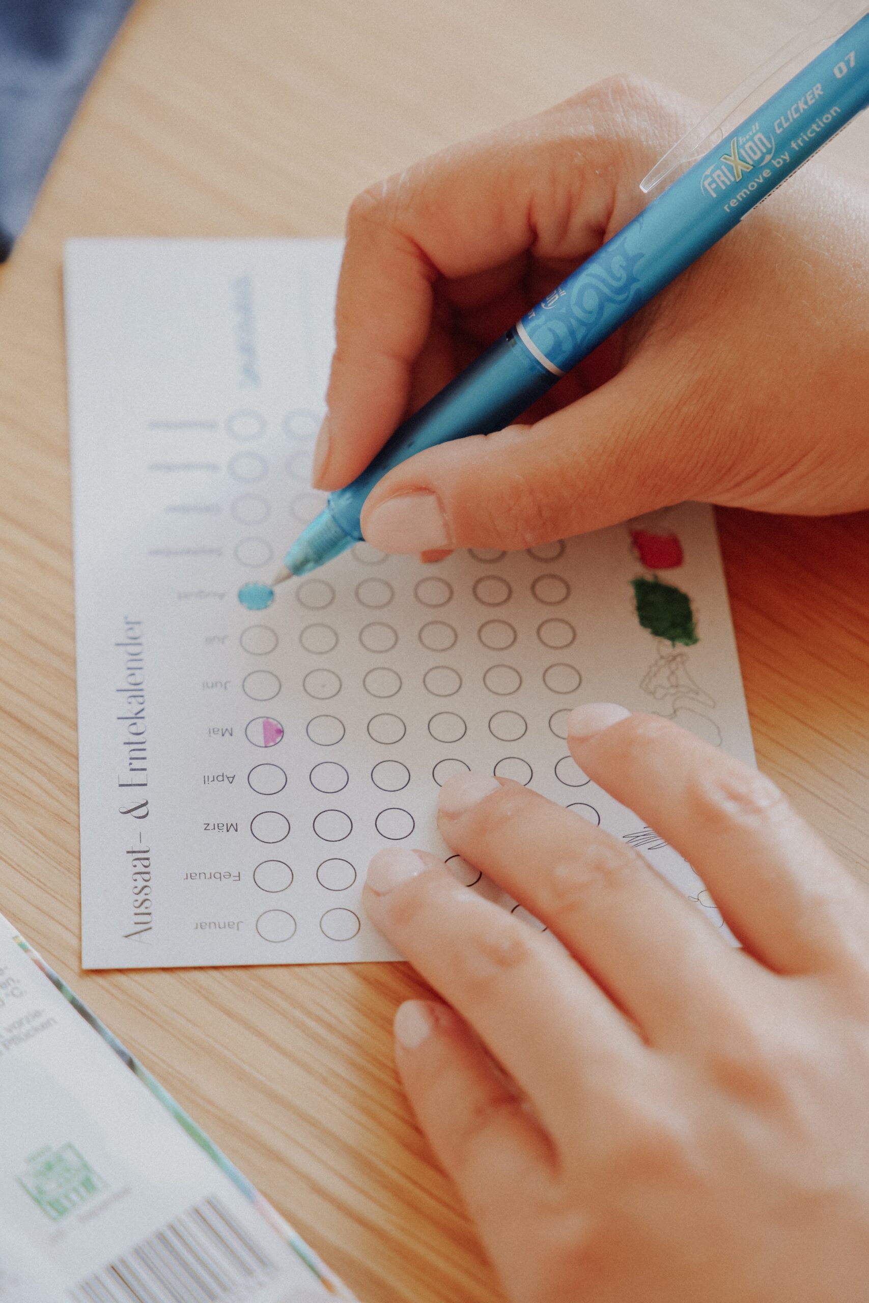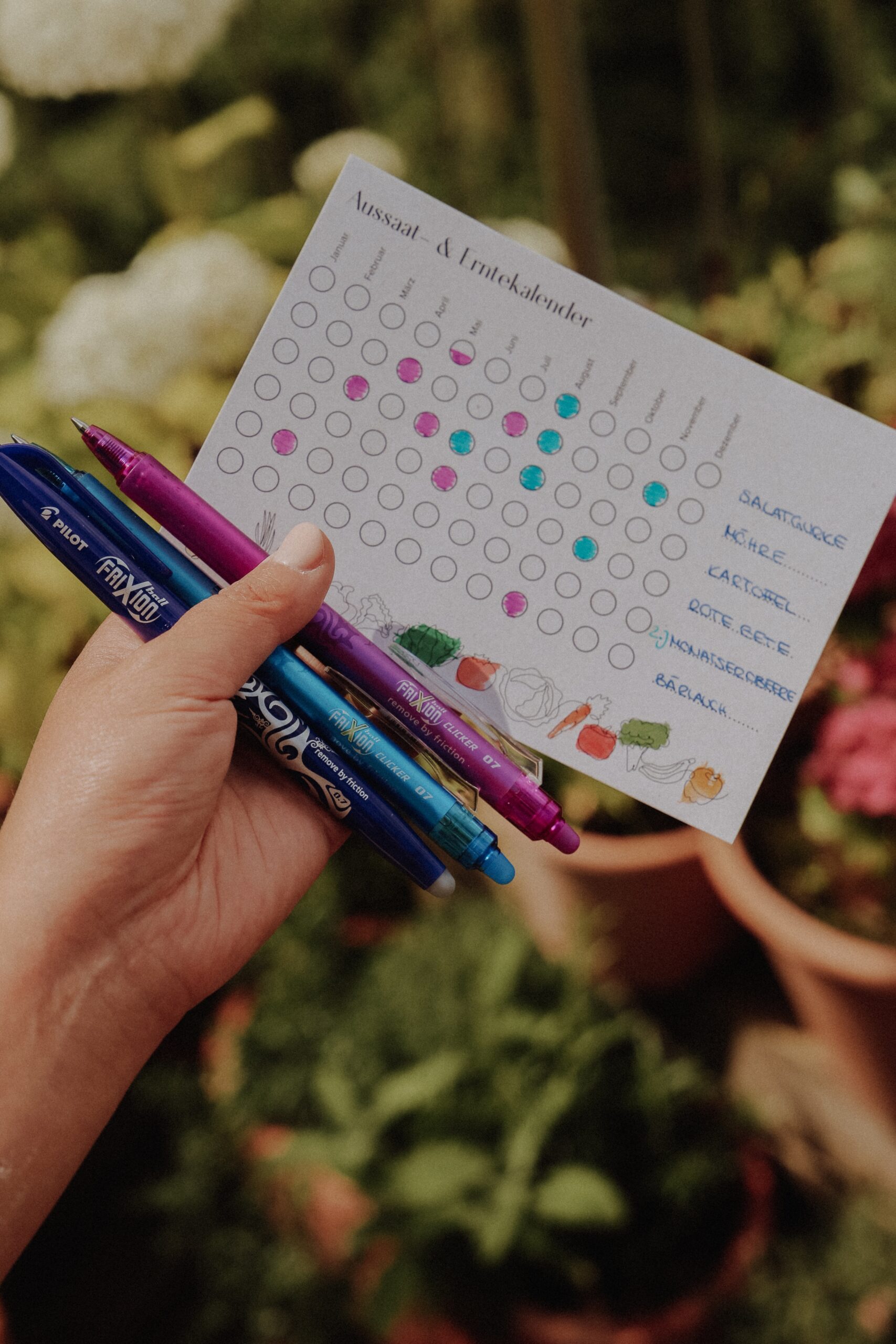 Zum Befüllen meines Aussaat- & Erntekalenders nutze ich die Tintenroller der FriXion Family von PILOT – seit meiner Schulzeit einfach meine liebsten Stifte, die ich täglich nutze. Das besondere ist die thermosensitive Tinte, die sich über eine Kunststoffkugel am Ende des Stifts wegradieren lässt, falls sich mal kleine Fehlerchen einschleichen. So habe ich all mein Saatgut zur Hand genommen und im ausgedruckten Freebie mein Obst & Gemüse eingetragen mit dem Monat, in dem es gesät wurde und wann es dann voraussichtlich bereit zur Ernte ist. Mit halb gefüllten Kreisen könnt ihr, um generelle Aussaat und Erntezeiten einzutragen, erkenntlich machen, wenn z.B. etwas erst ab Mitte Mai ausgesät werden sollte.
